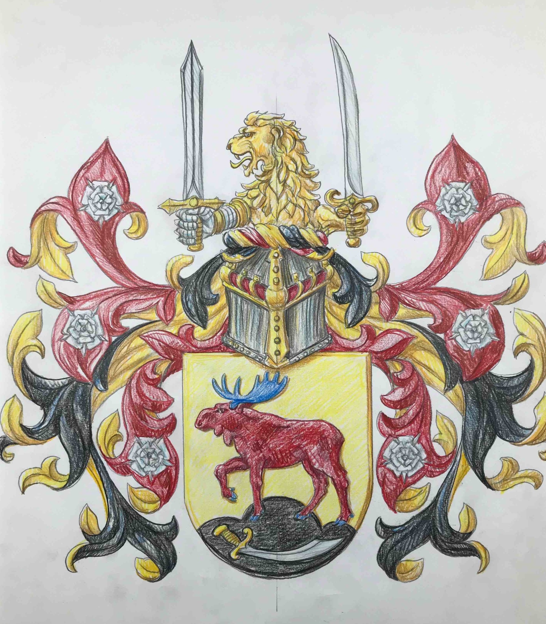 Varje sköld och motiv bär sin unikitet och är vackert skissat med Polychromos skisspennor på teckningsark.